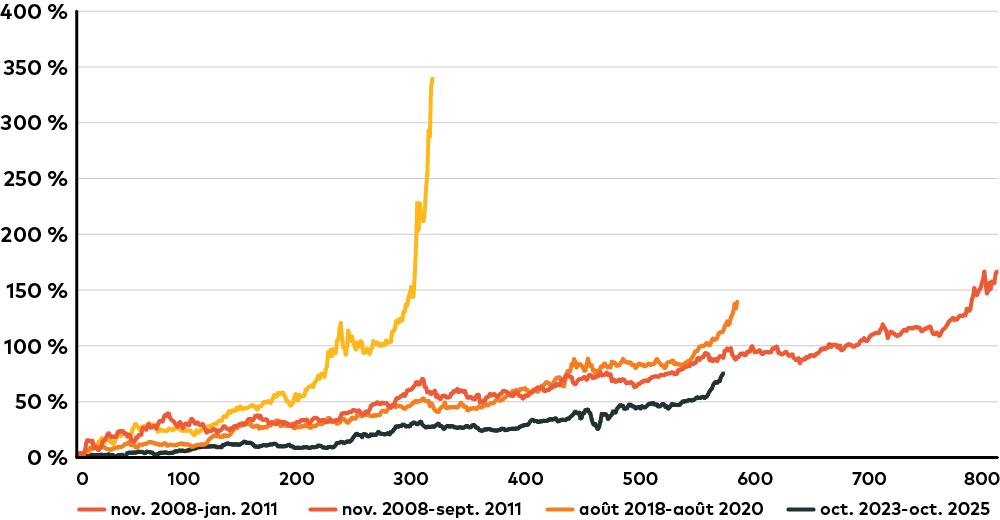Bien que la hausse actuelle des cours de l’or semble extrême, elle n’est pas excessive en ce qui a trait à sa durée ou à l’appréciation des cours, selon nos recherches sur quatre grandes périodes de hausse des prix de l’or depuis les années 1970 (après Bretton Woods). En ce qui concerne les gains en pourcentage, la hausse de l’or en 2025 a été de 14 % rien qu’au cours du récent bond de 3 500 $ US à 4 000 $ US l’once, un rythme rapide semblable à l’accélération observée lors de la forte hausse de 2011.